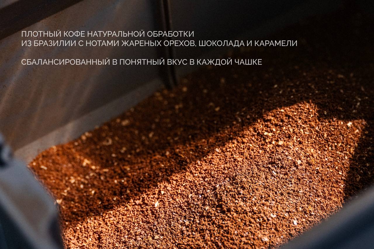 Плотный кофе натуральной обработки из Бразилии с нотами жареных орехов, шоколада и карамели. Сбалансированный, знакомый вкус в каждой чашке.